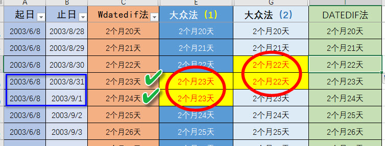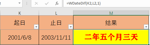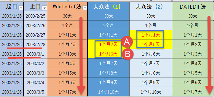 为此,笔者基于日差计算的长期广泛的迫切需求,构造了自定义函数 WDateDif,解决了上述问题,使得计算结果满足了唯一性、连续性的基本要求,超越了基于自然月的普通方法,体现了计算的严谨性。