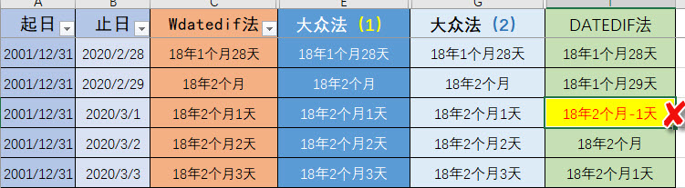 上图就是采用Excel隐函数DATEDIF,出现了不可接受的结果。