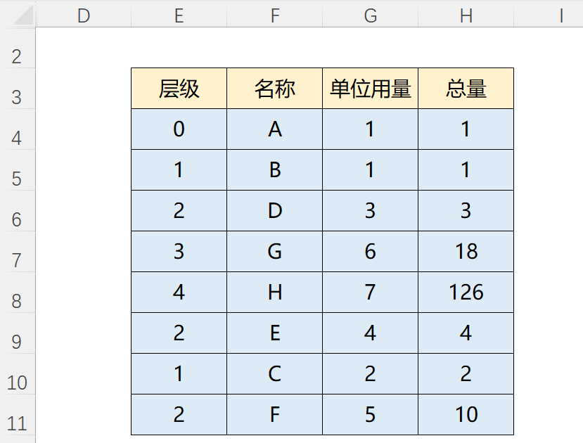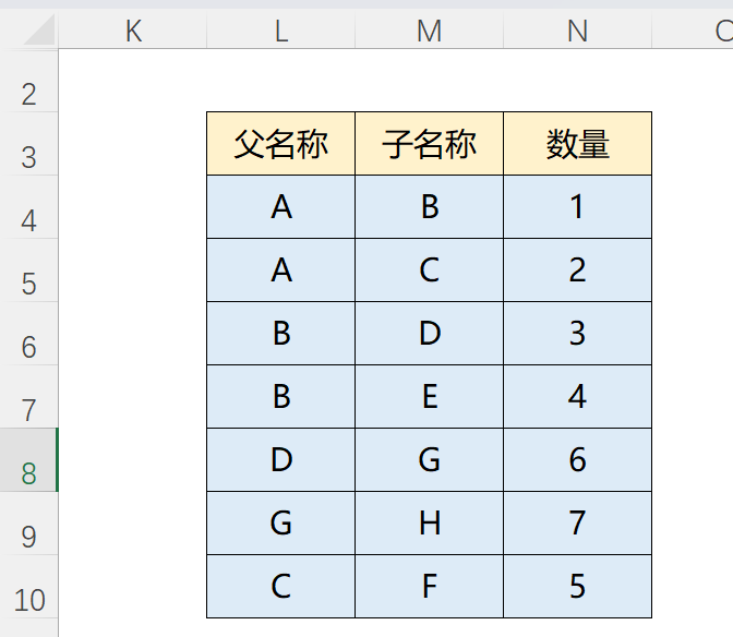 (示例2)先选择E4:H11,窗口上选择【树形结构转父子结构】,结果是下表: