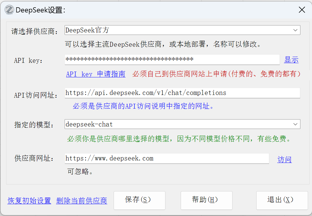 由于Excel必备工具箱致力于可以接入各种Deepseek供应商提供的服务,所以设置界面相对复杂,如下图: