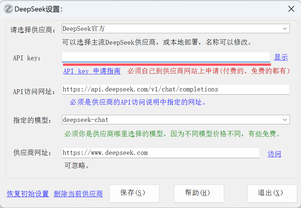 如果需要使用其他网站或本地部署的DeepSeek服务,那么还需要继续进行其他设置,下面还是以DeepSeek官方的接口文档进行说明:
