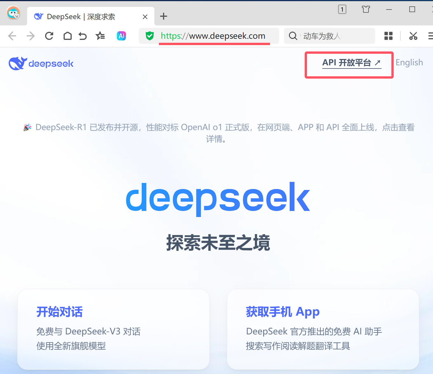 1、由于本例是DeepSeek官方,所以当然去DeepSeek官方网站(https://www.deepseek.com)去申请: