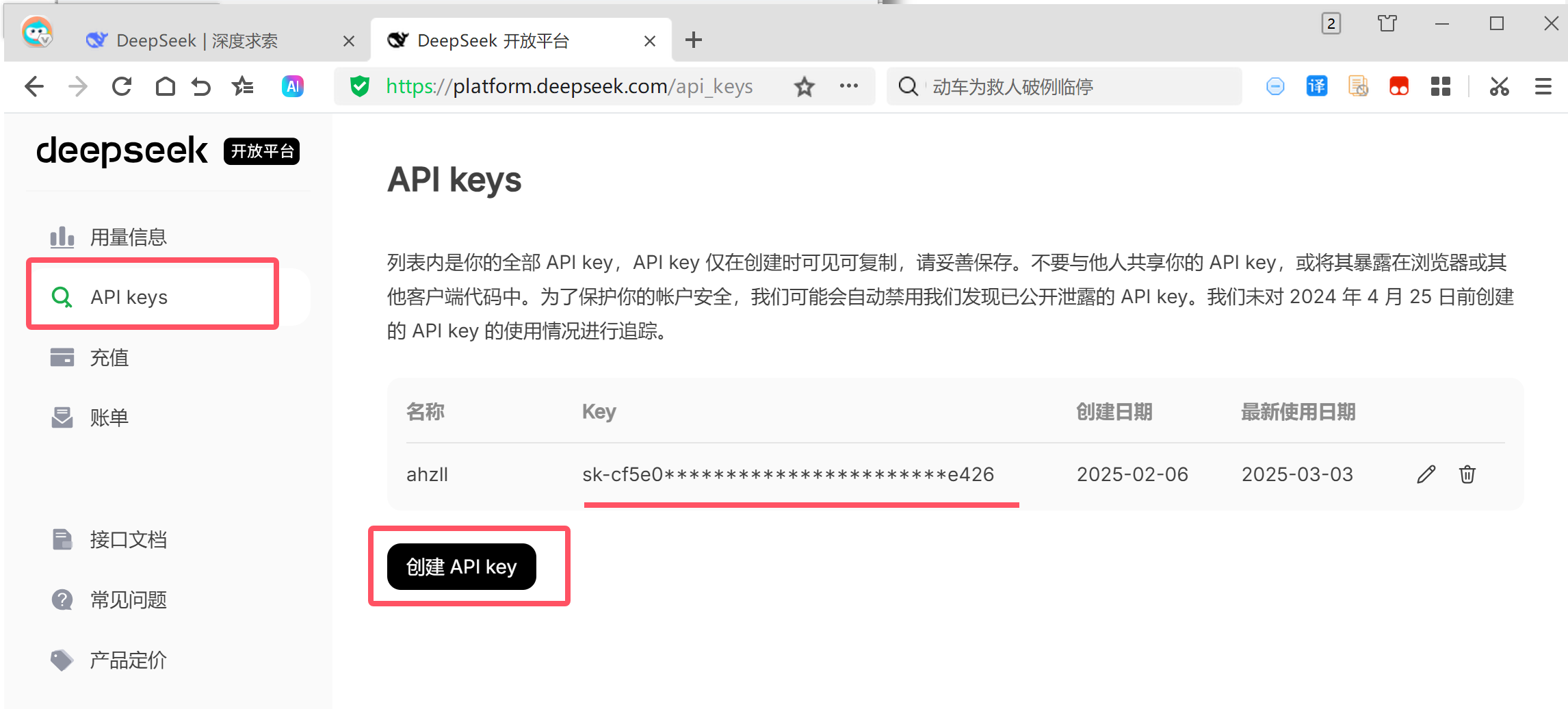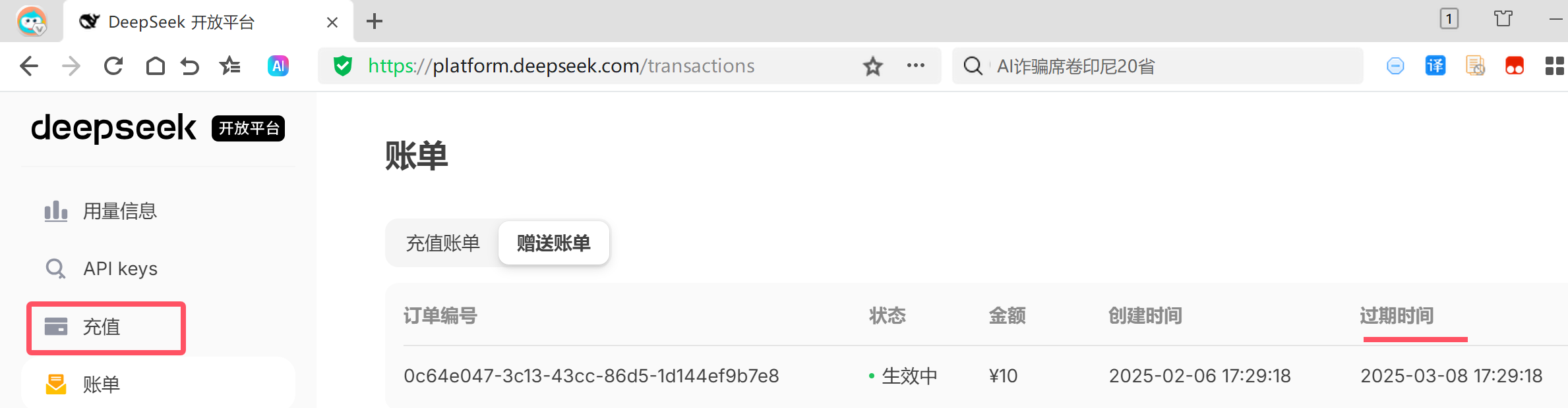 DeepSeek API key 免费期满后会收费,所以需要查看是否欠费,当然你也可以去其他网站继续寻找免费的deepseek服务: