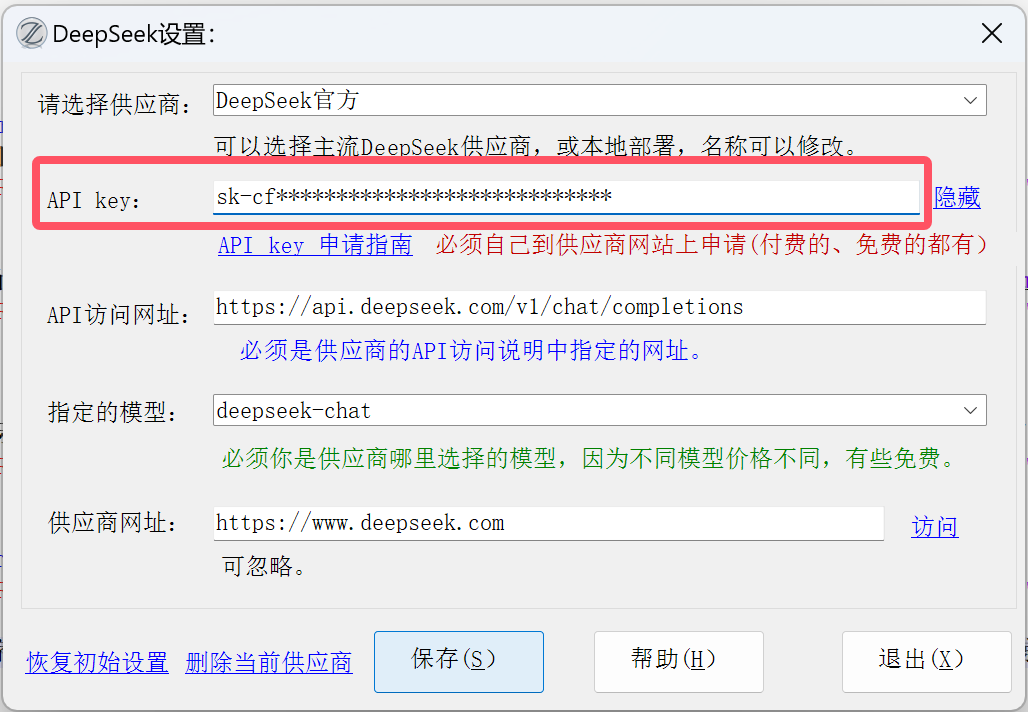 补充说明:【DeepSeek官方】的模型代码是deepseek-chat,对应的实际模型是:DeepSeek-V3; 如果想使用DeepSeek-R1(速度可能慢一些),那么指定的模型那里就需要输入:deepseek-reasoner
