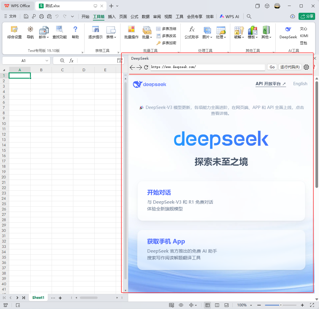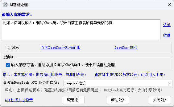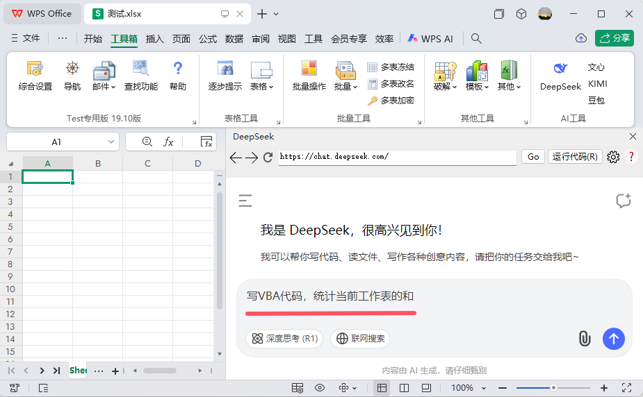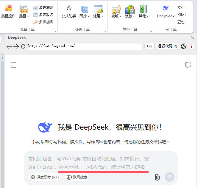 19.10版改进:DeekSeek功能采用默认嵌入DeepSeek网页的方式,完全免费,保持了网页版所有追加提问、历史记录、上传文档等优点,而且在生成VBA段上面,直接增加【运行代码】按钮,一键实现自动化处理,非常方便!