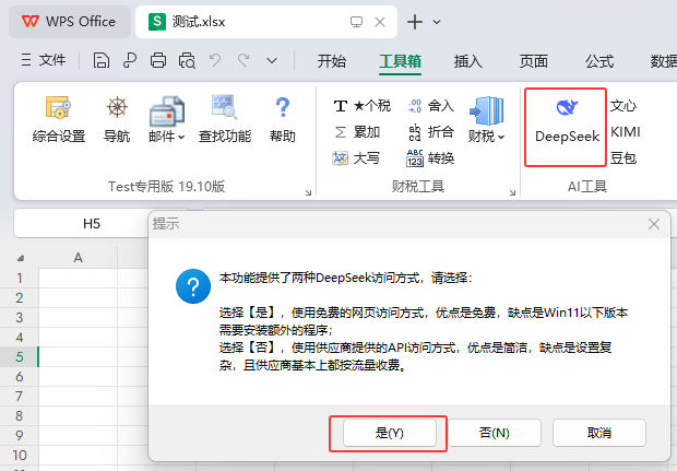 1、首次使用DeepSeek功能时,会提示选择使用方式,请点击【是】:
