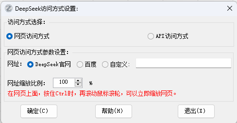 设置按钮(就是那个齿轮图标),点击后,可以设置访问方式,缩放比例,默认的DeepSeek网页: