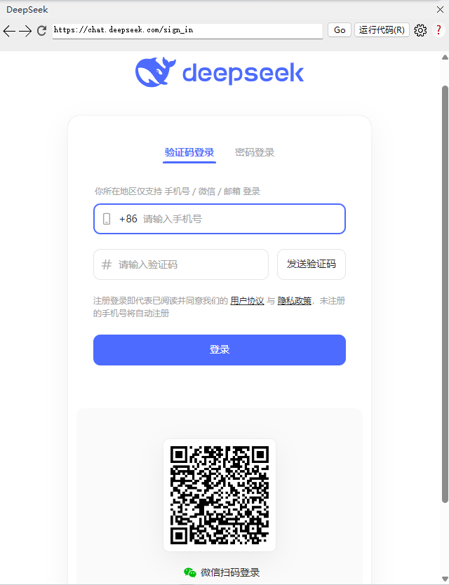 3、点击开始对话,就会进入deepSeek登录界面,手机短信验证和微信验证都可以。