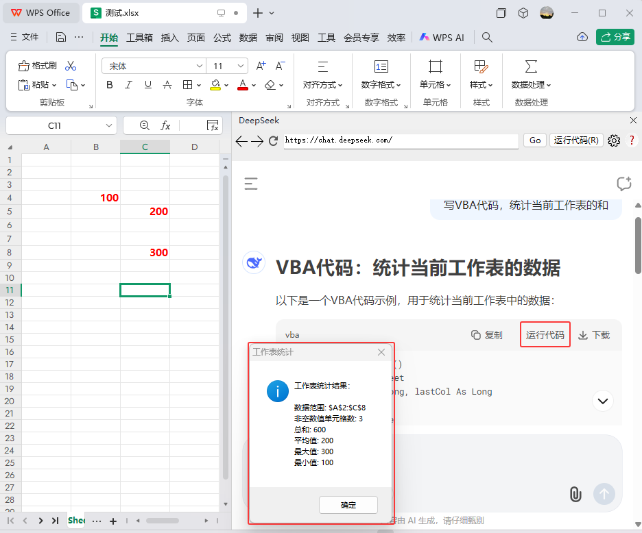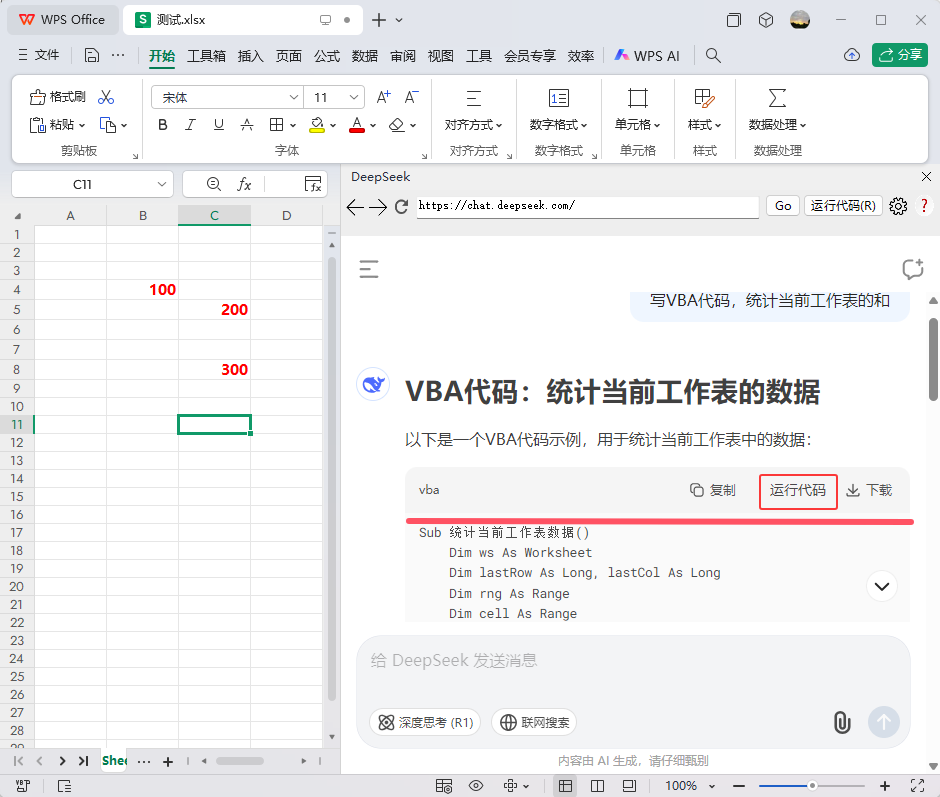 通过滚动网页,可以看到deepseek生成的VBA代码。这里的运行代码按钮是工具箱自动添加的。