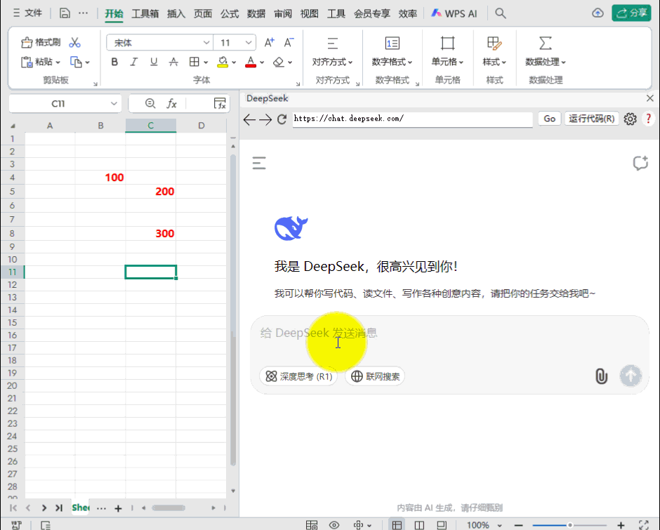 4、登录完成后,就可以使用deepseek,进行表格智能化处理了: