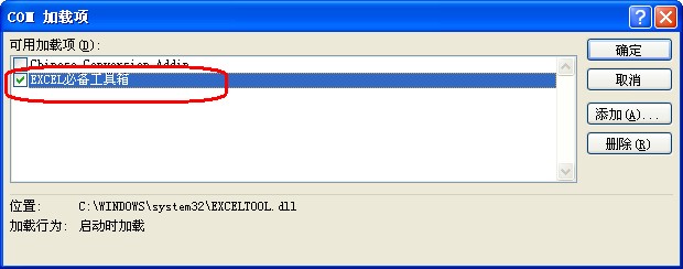 注意:不同excel版本出现的名称可能不出现“EXCEL必备工具箱”字样,只出现:EXCELTOOL.dll