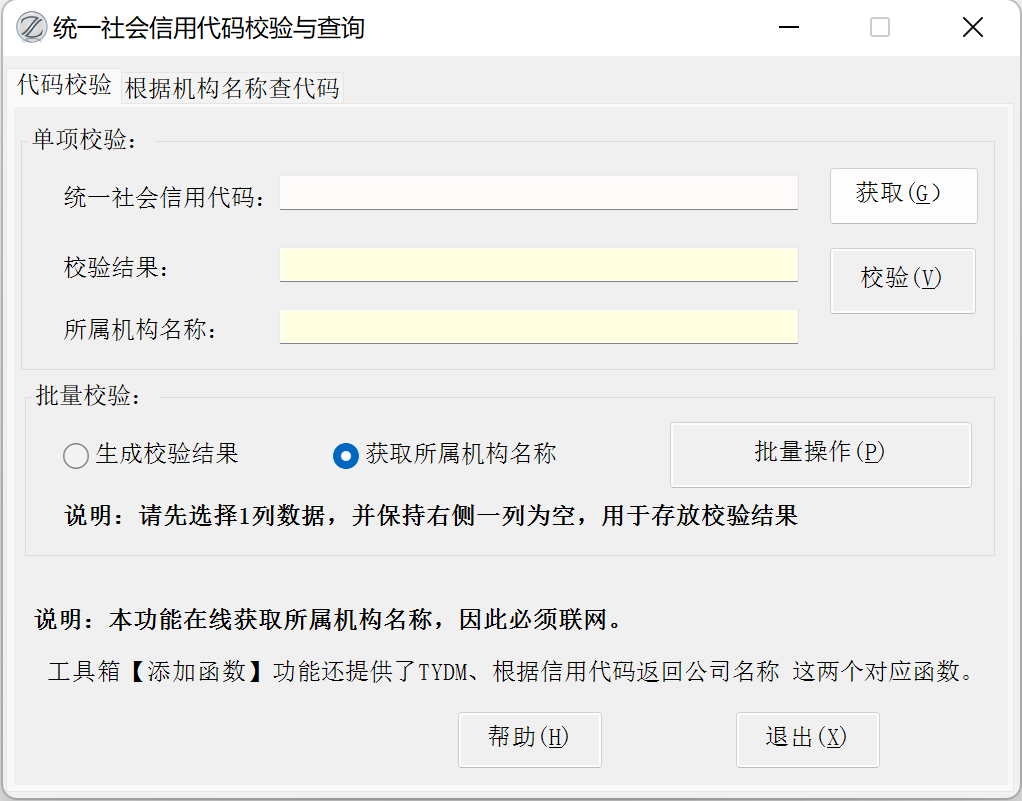 功能简介:用于统一社会信用代码校验与查询,对查询不到的名称的再次用其他网站数据查询,确保所有信用代码都尽可能获取名称。还可以根据机构名称查询统一社会信用代码。