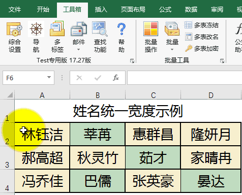 EXCEL必备工具箱, 统一姓名宽度功能,批量将所选区域内两个字的姓名内添加全角空格(如果添加的普通空格,会造成不同字体下不能对齐),使得两字姓名与三字姓名同样宽度,更加美观,更加符合中国人习惯。