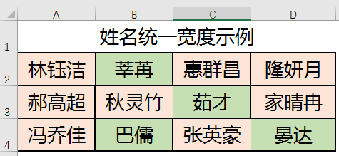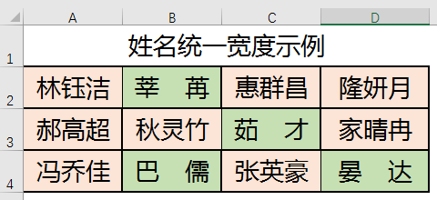 上表中既有三个字的姓名,也有两个字的姓名,宽度不统一,不够美观。如果只是中间插入两个空格,在不同字体情况下,宽度还是有些许差异。