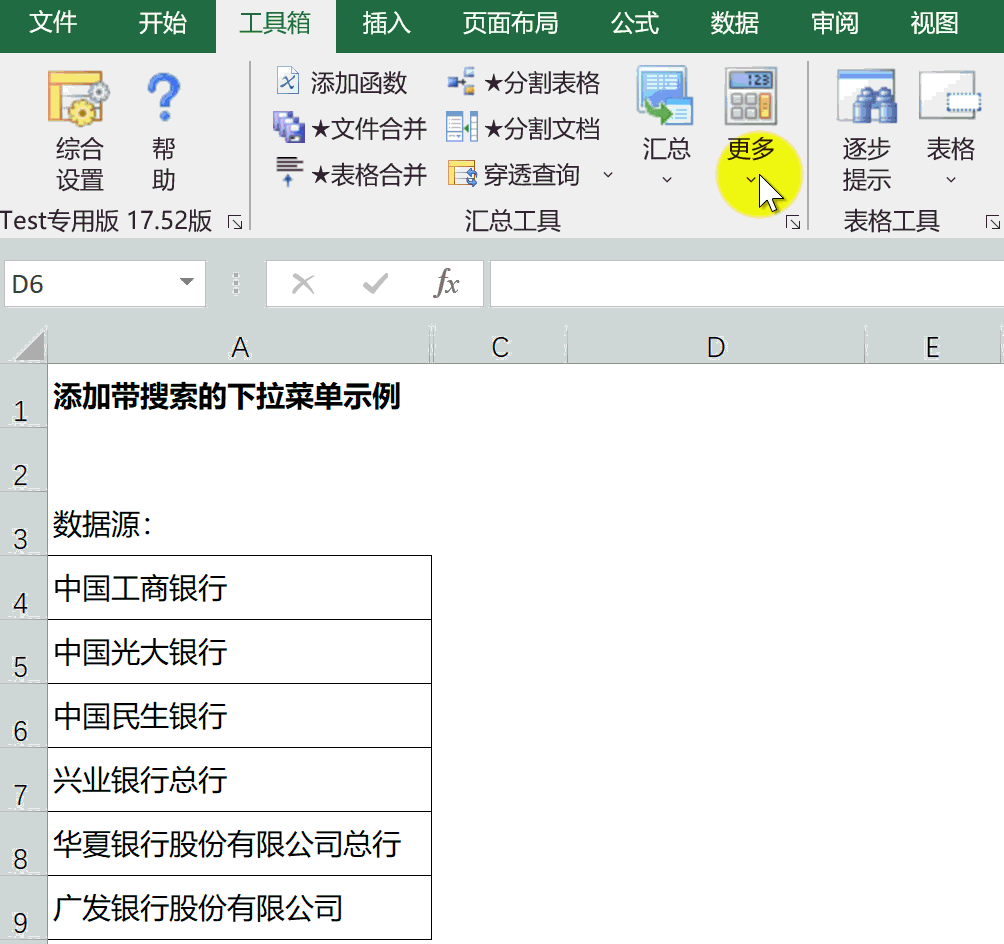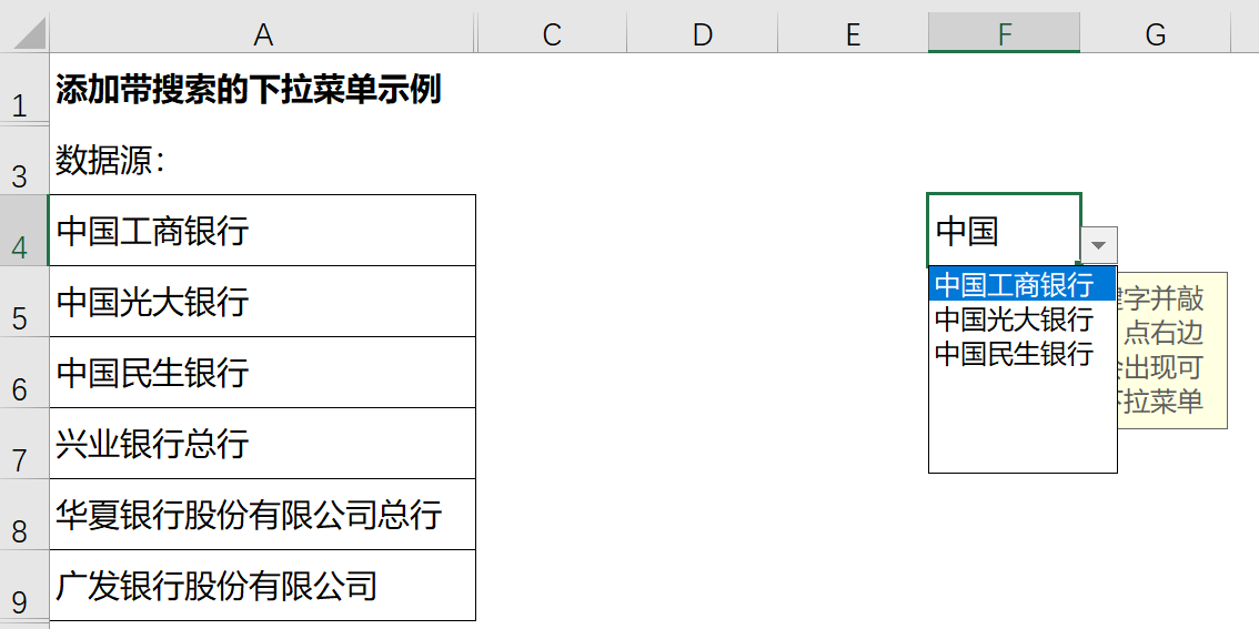 这样F列每个单元格都添加了下拉菜单,这些单元格选择后,输入要搜索的关键字,比如:中国,就会有中国工商银行、中国光大银行、中国民生银行供选择