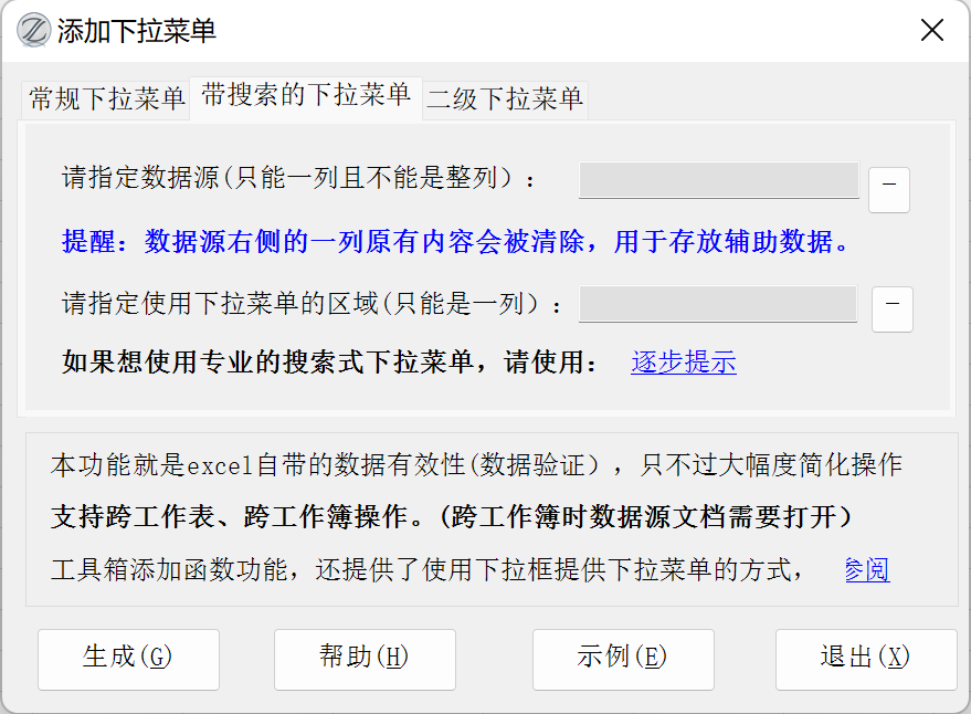4、本功能里的带搜索的下拉菜单,由于也是用数据有效性功能,比较简单,如果想使用专业的搜索式下拉菜单,请使用:逐步提示