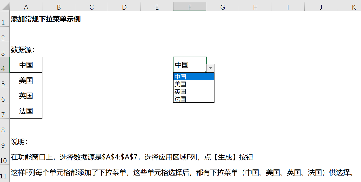 在功能窗口上,选择数据源是$A$4:$D$10,选择应用区域F4:F5,点【生成】按钮,会为F4:F5添加下拉菜单