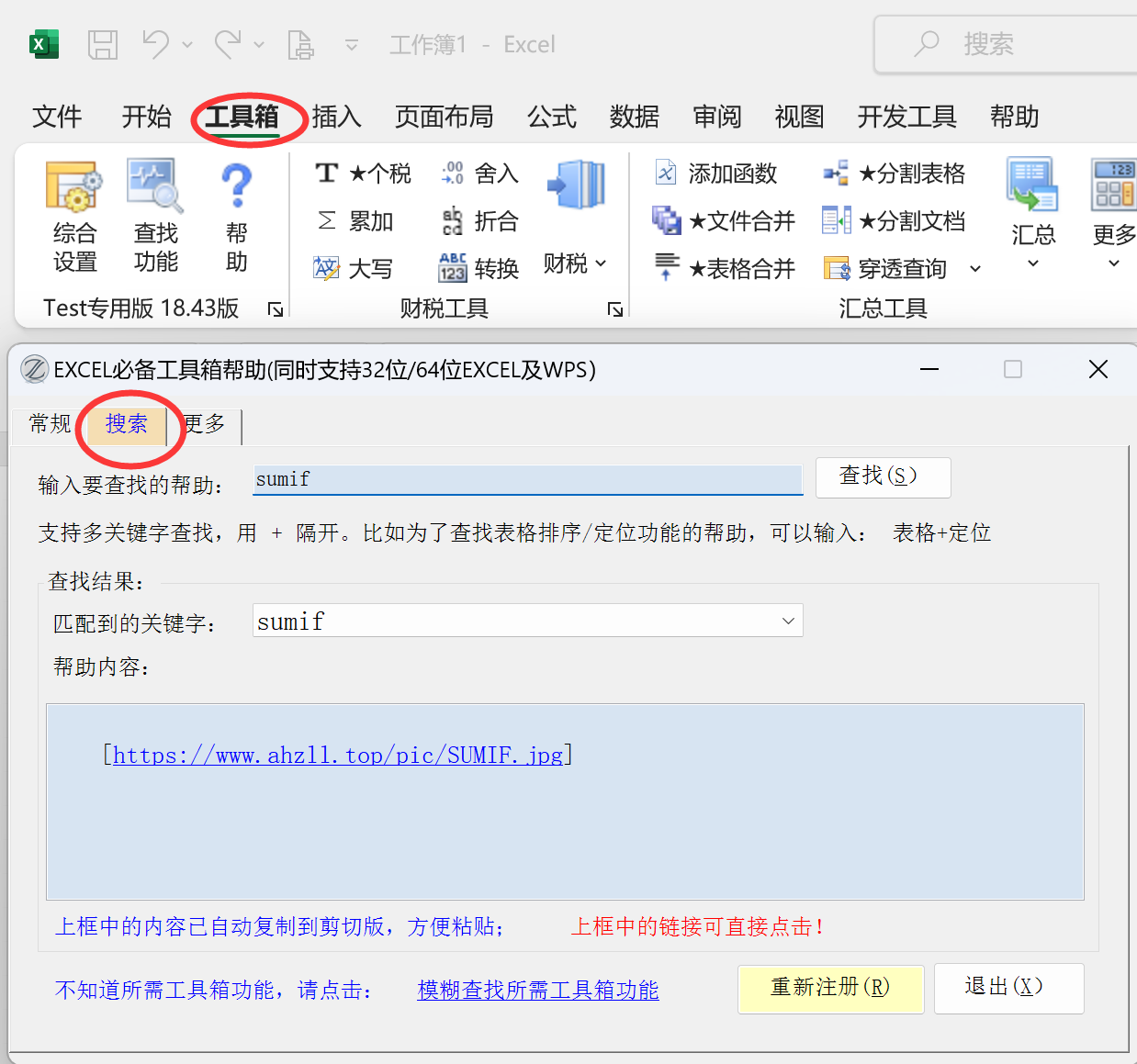 提供了搜索函数和Excel必备工具箱各项功能的帮助的搜索,可以输入关键字获取帮助网页网址,让你快速了解工具箱各个功能!