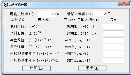 财务人员经常会用到各个复利系数,特别是财务管理和经济性评价方面使用较多,本功能能快速计算各项复利系数,并提供在EXEL中如何进行复利系数计算的公式。