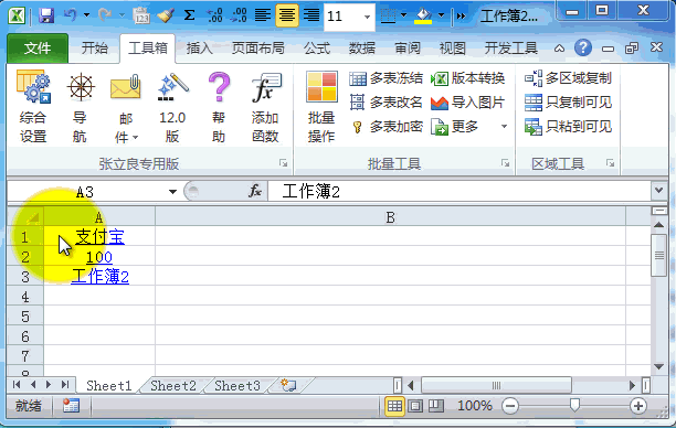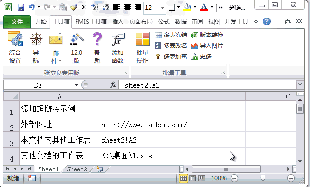 有网友提出:实用“批量添加超链接”功能的时候,如果工作表名带有“-”或空格等符号,就会引用无效。经测试,请在提供超链接字符串时加上单引号界定符,如:'sheet2'!A2.(如果这个单引号是该单元格内第一个字符,则需要输入两个单引号: