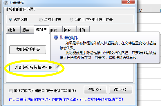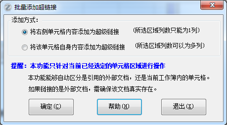 为选定的一列数据,批量添加超链接,或将其右侧内容添加为超级链接,能够自动区分是引用的外部文档,还是当前工作簿内的单元格。(本操作只对选定区域生效)