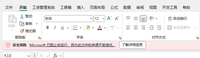 4、在Excel里打开时,若提示:【Microsott 已阻止宏运行,因为此文件的来源不受信任】,会导致无法启用宏,最终导致功能无法使用: