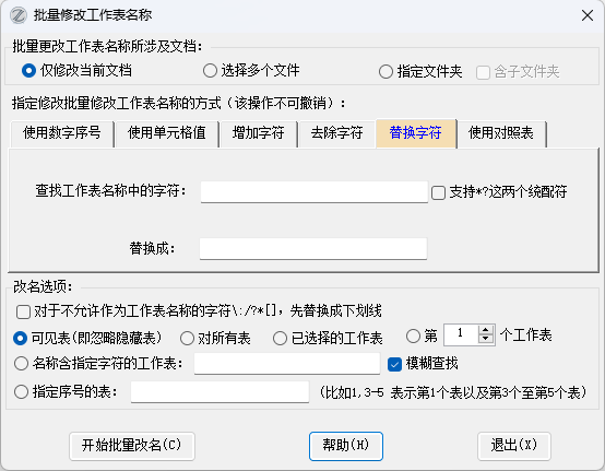 原来功能是对所有工作表进行操作,现在增加了选项,可以只对已选择的工作表进行批量更名操作。