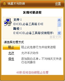 通过开始菜单卸载EXCEL必备工具箱时会出现未知木马提示,瑞星公司答复:仅仅是风险提示,并不代表是木马,因此不予处理。