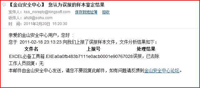 误报文件上报中心:http://www.ijinshan.com/virus_report/