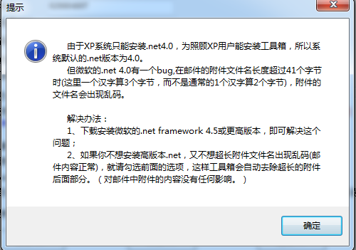 由于XP系统只能安装.net4.0,所以为照顾XP用户能安装工具箱,所以系统默认的.net版本为,但微软的.net4.0有一个bug,在邮件的附件文件名长度超过41个字节时(汉字算3个字节),后面部分会被忽略,对邮件内容无任何影响。提醒:目前工具箱集成了.net framework4.8,已经不存在这个问题。(以前版本即使安装了高版本的.net framework也无效,本次予以改进)