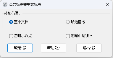 12.20版改进:增加了窗口界面,允许选项是否对整个文档还是对当前选择区域进行操作,还可以选择【忽略小数点】、【忽略中划线】