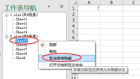 如果当前右键点击的工作表节点对应的工作表隐藏的,则这里“隐藏表格”菜单会变成“取消表格隐藏”,同时,由于隐藏表格很多操作都不能使用,所以会自动隐蔽不能使用的菜单: