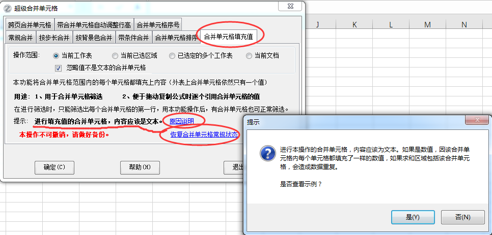 本功能是利用excel合并单元格的bug来实现的,既然是bug,就有使用限制,因此请确保这些需要填充值的合并单元格里面的数值不参与合计运算。