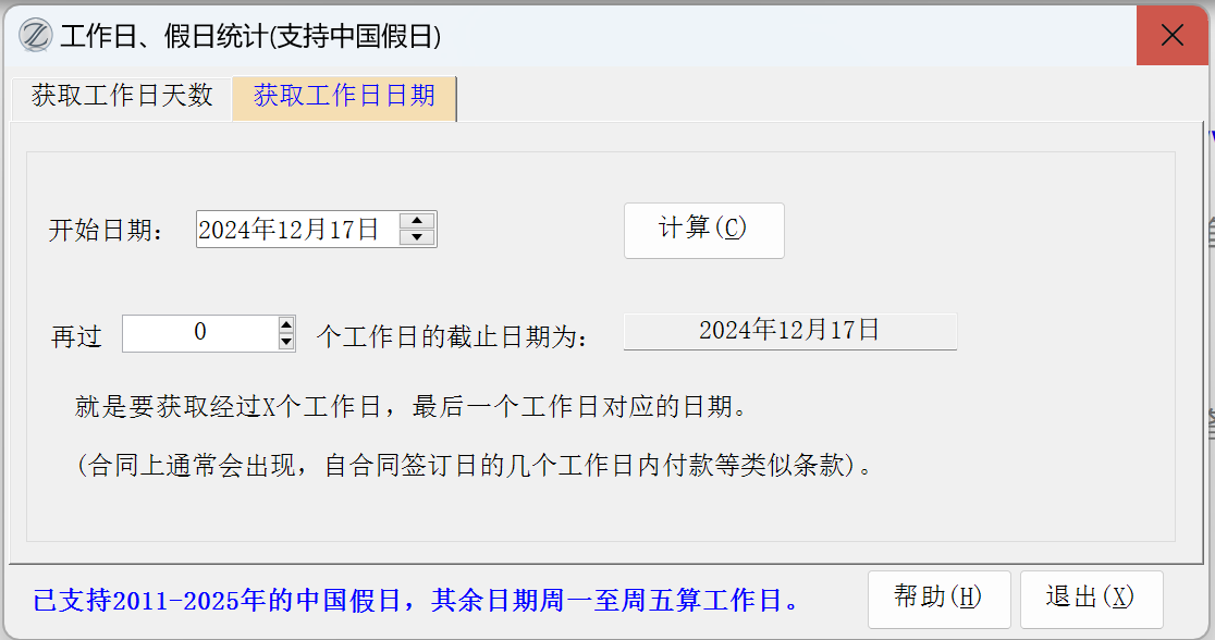 15.93版改进:增加了对2020年中国假日的支持,增加了“获取工作日日期”的功能。