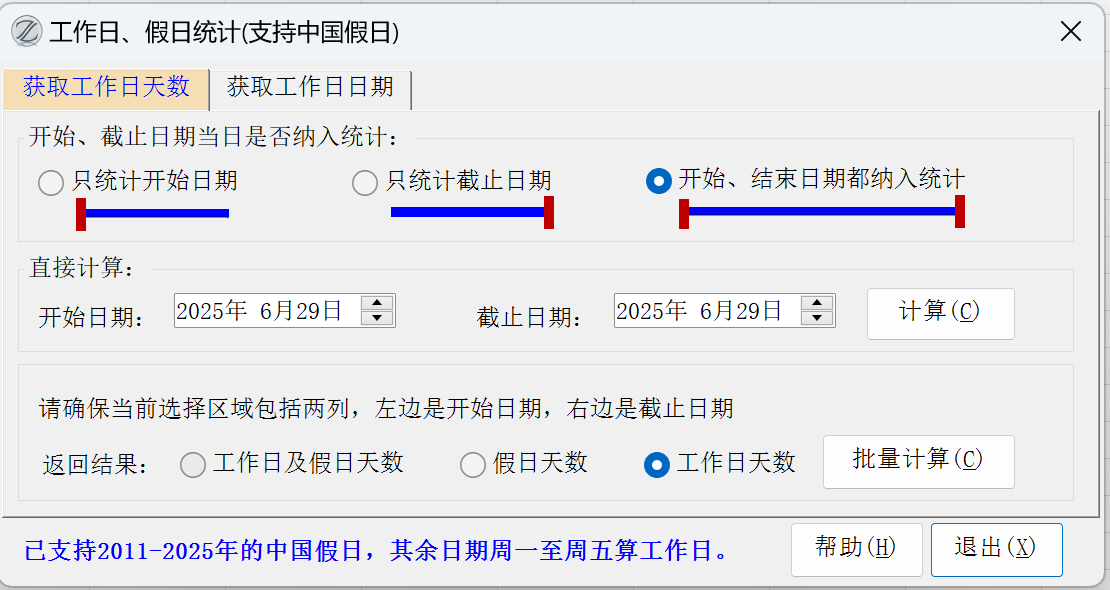 由于中国传统节日放假问题,导致工作日天数统计非常不方便,所以根据网友建议增加了此功能,已支持2011-2024年的中国假日,其余日期周一至周五算工作日。以后会每年更新。
