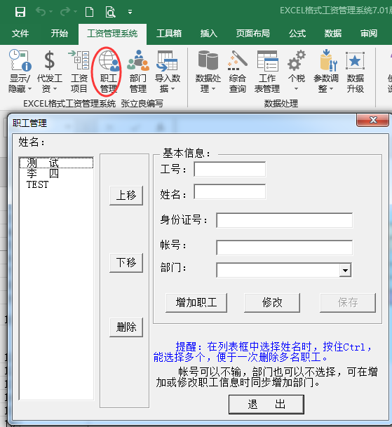 上面的“导入数据”功能相当于批量管理员工信息,而这个“职工管理”相当于对个别员工进行微调。