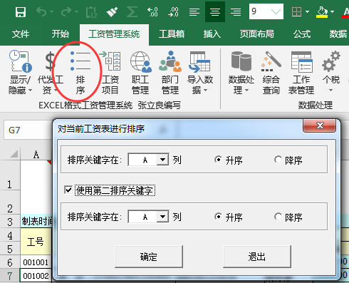 用于对当前工资表进行排序,可以指定两个排序关键字,便于快速调整员工先后顺序。