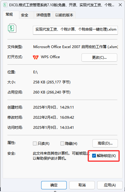 解决办法非常简单:保持文档处于关闭状态,(1)点【右键】,(2)点【属性】,(3)勾选【解除锁定】,(4)点【确定】即可。如下图: