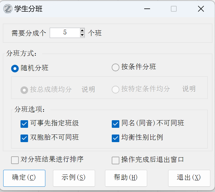 功能介绍:既可以随机分班,也可以按成绩或特定条件分班,还可以考虑同名(同音)不同班、双胞胎不同班、指定分班、均衡男女生比例等各种特殊情况,简单方便,能满足学生分班的各种特殊情况。