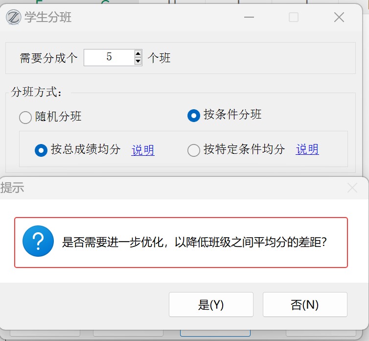 在完成分班后,会额外提示是否进一步优化,降低各班平均分的差额: