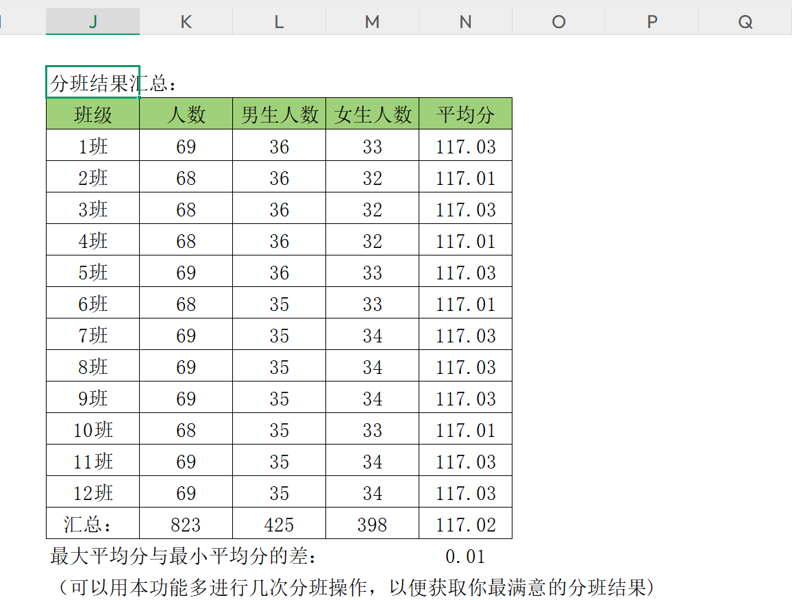 生成的分班结果会有各班的平均分,示例如下图: