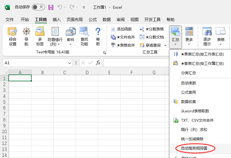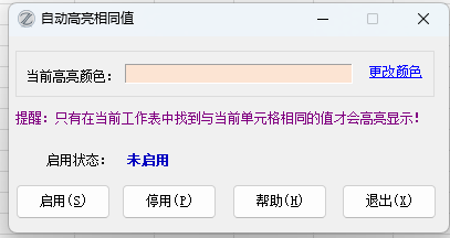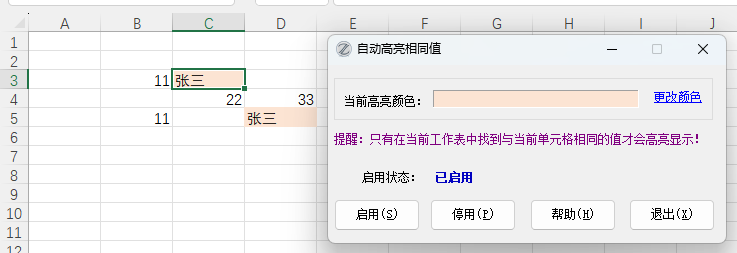 EXCEL必备工具箱,自动高亮相同值功能,启用本功能后,在切换单元格时,会自动高亮显示当前工作表相同值的单元格。