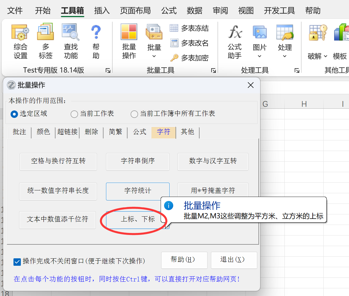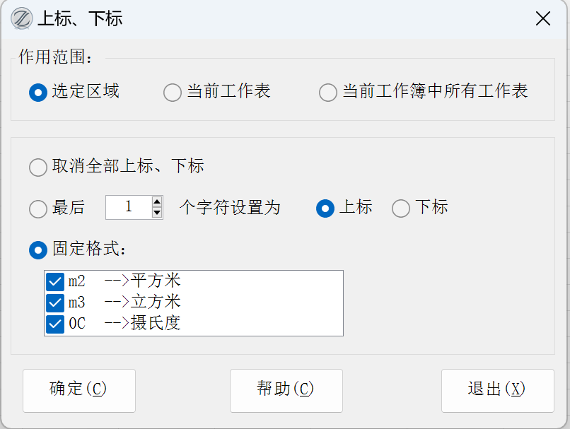 EXCEL必备工具箱,批量添加“上标、下标”功能,可以批量将M2,M3,OC等转成平方米,立方米,摄氏度,解决了批量设置上标、下标的不便!